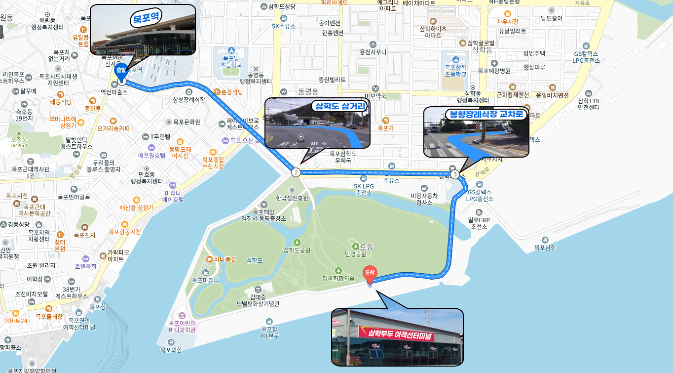 목포역 → 삼학로 856m 직진 (삼학도 삼거리) → 삼학로 유달경기장 방면으로 좌회전 후 직진 → ③ 봉황장례식장에서 김대중노벨평화상기념관 방면으로 우회전 후 649m 이동 → 삼학부두 여객터미널 도착(약 6분소요, 2.1km, 택시비 약 4,800원)