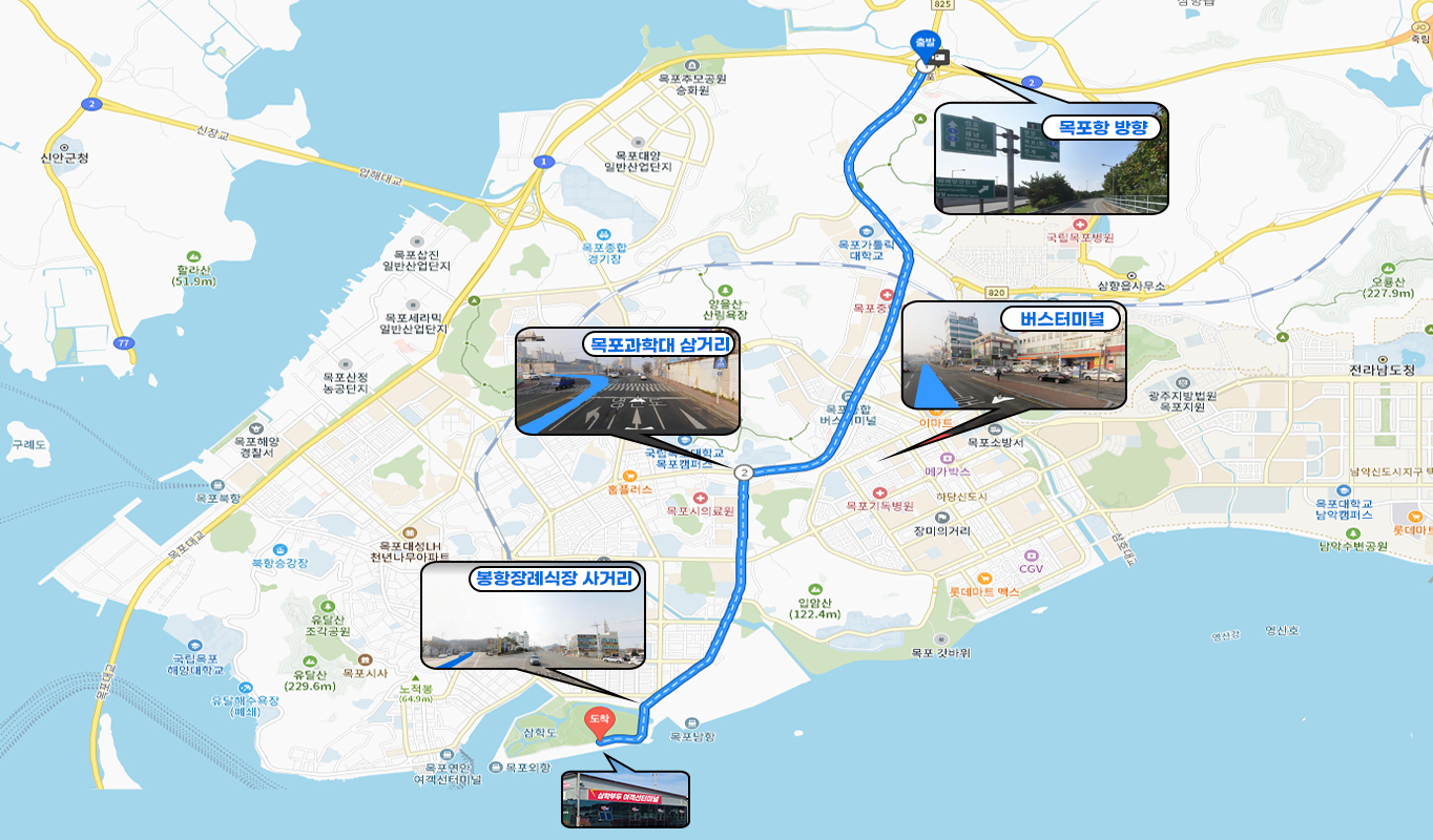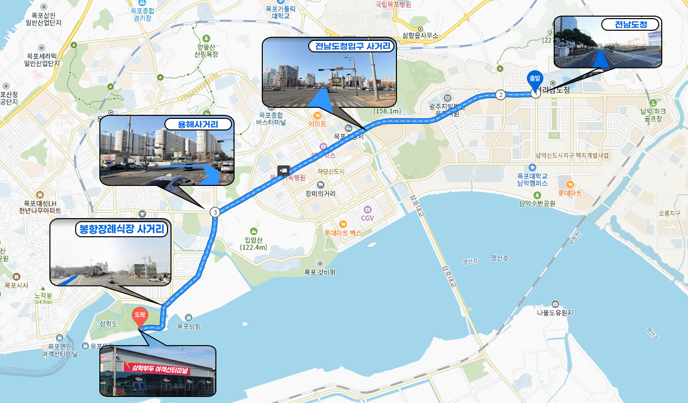 ① 전남도청(목포역 방향) → ② 도청입구 사거리(4.1km, 12분소요) → ③ 용해 사거리 (4.0km, 13분소요) → ④ 봉황 장례식장 사거리(1.6km, 3분소요) → ⑤ 삼학부두 여객선터미널(총 약 20분소요, 7.8km)