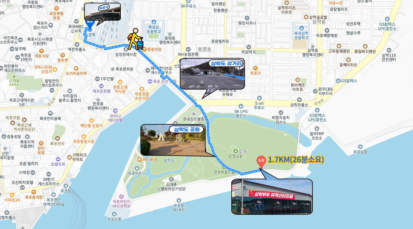 목포역 → 삼학도 삼거리(900m, 15분소요) → 삼학도공원에 진입하여 경북화합의 숲방향으로 이동 (400m, 6분소요) → ③ 삼학부두 여객터미널 도착(총 소요시간 25분, 1.6km)