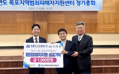 2025년 3월 6일(목) 11:20 신안비치호텔목포지역범죄피해자지원센터 2025년 정기총회가 소집되었습니다.씨월드고속훼리(주) 이혁영 회장(고문) 이종훈 대표(신임이사)가 참석하여범죄피해자지원 성금 금1,000만원을 기탁하였습니다.